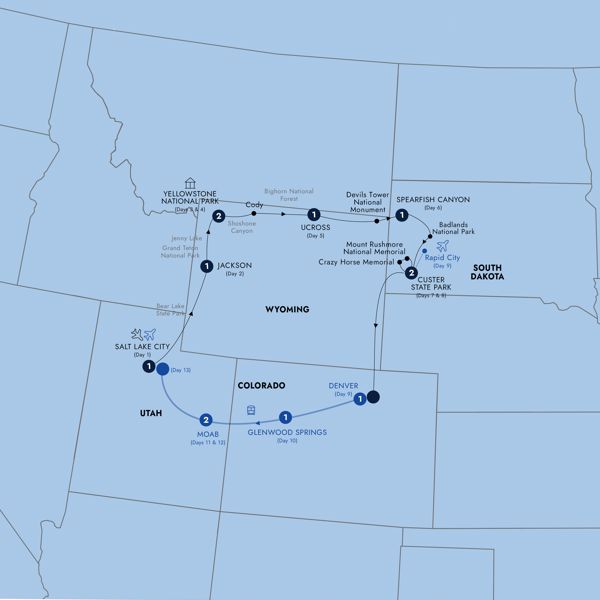 Experience the rugged and wild West during this 13-Day tour. Start in Salt Lake City, and then head to Jackson & the Grand Tetons. The adventure continues to Yellowstone National Park where you will walk beside the rainbow-hued hot springs and watch Old Faithful spew water more than 120 feet into the air. In Cody, see a firearms collection at the Buffalo Bill Center. Travel to Devils Tower, a butte of igneous rock jutting from the craggy Black Hills mountains. Here, you will also learn about the Western legends Wild Bill Hickok and Calamity Jane. Then head to Mount Rushmore National Memorial, where the visages of Presidents Washington, Jefferson, Lincoln and Roosevelt are carved into the mountainside. And ascend 563 feet to the top of Crazy Horse Memorial, named for the Lakota warrior, and stand face-to-face with the world’s largest mountain carving.