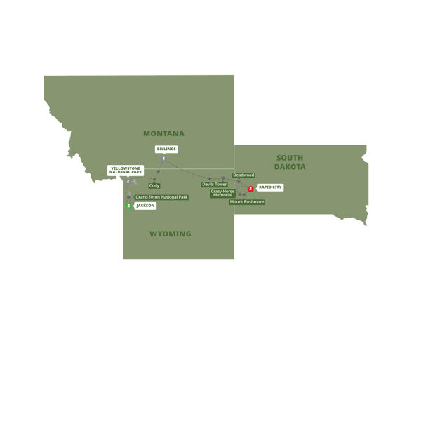 Saddle up for this gallop through the American frontier. Admire the peaks of Grand Tetons, spot the bison in Yellowstone National Park, see Mount Rushmore and explore the Black Hills. Visit the historic town of Cody, made famous by Buffalo Bill, then stand in awe at the towering Devil's Tower National Monument. Visit Crazy Horse Memorial where you'll be reminded that wonder is never far from sight.
