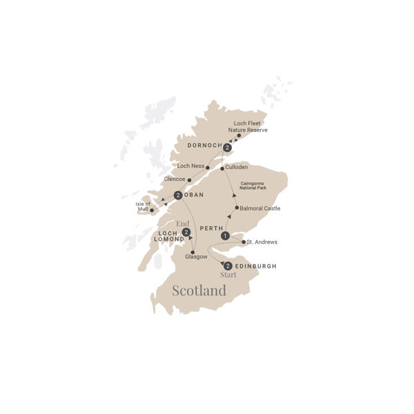 Experience the best of Scotland, from its dramatic Highlands and rugged islands to its rich cultural heritage, on a journey thoughtfully designed to support the environment, local communities and heritage preservation. With more MAKE TRAVEL MATTER® Experiences and sustainable partners than ever, this tour ensures your travels have a positive impact. Meet a descendant of Robert the Bruce at his ancestral home; visit the Balmoral Estate, a royal favorite of King Charles; and explore the revival of tartan at Prickly Thistle, Scotland’s first B-Corp certified textile mill. Search for seals, whales and seabirds in the pristine waters off Dornoch Bay and the Isle of Mull, supporting conservation-focused local operators. Unwind in luxury at Cameron House on the edge of Loch Lomond, where you can glide across the loch on an elegant champagne cruise-all while embracing a new era of responsible, high-end travel.