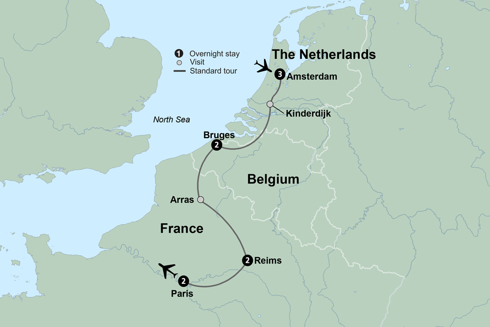 From iconic Dutch windmills and cozy Belgian streets to the world-renowned Champagne region and the “City of Light,” experience the essence of three European countries. Connect with deeply rooted cultures as you make your way through the Netherlands, Belgium, and France.