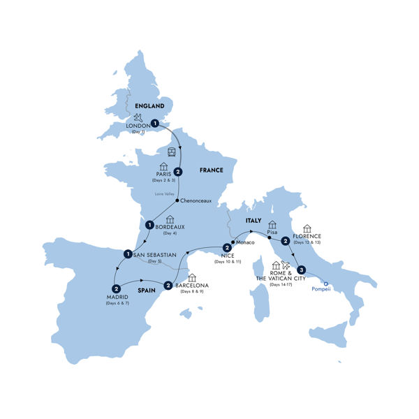 Relax and enjoy the grand landscapes of the Chianti hills and Umbria, before passing the Apennine Mountains to arrive at the Eternal City, filled with classic antiquities, medieval buildings, Renaissance palaces and Baroque churches. In the evening, what better way to toast the culmination of your Mediterranean journey, than with delicious Italian cuisine and wine.