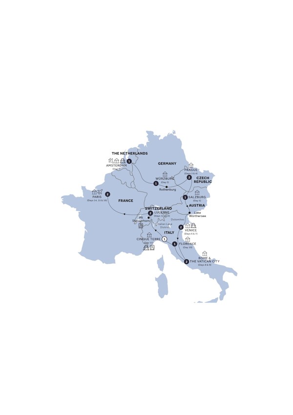 From Amsterdam to Rome and onto Paris, this grand tour takes in Cinque Terre, abundant Florence sightseeing and a delectable Lucerne Dine Around evening. Your perfect introduction to the Netherlands is a curated cruise through the canals led by local experts. Onwards in style into Germany, the Rhine's UNESCO world heritage sites give way to the golden city of Prague-where your local guide will lead you through the hilltop castle courtyards and the grandiose St Vitus Cathedral or through the Jewish Quarter. A tour of Italy serves up the gondola-filled canals of Venice and the opulence of Rome, before Swiss delights beckon in Lucerne. Paris dazzles last with a chance to shop the city's boutiques like a local and enjoy views of iconic sights, including Notre-Dame and the Louvre.