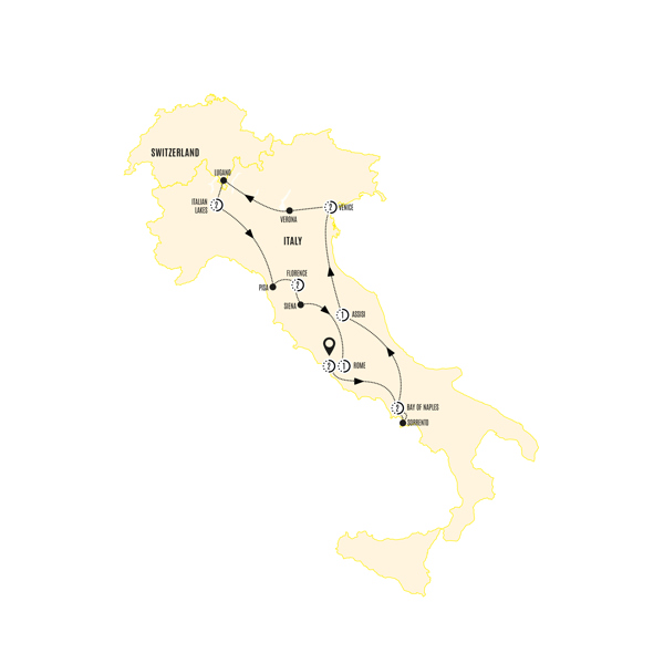 Discover the splendor of 'la bella Italia' on this 13-day journey through charming countrysides, picturesque towns, and vibrant cities. Explore the ancient history of Rome, the tranquil beauty of the Italian Lakes, and the artistic brilliance of Florence. Find quiet inspiration in Assisi, soak up the sun along the Bay of Naples, and discover why Italy’s allure is truly unmatched.