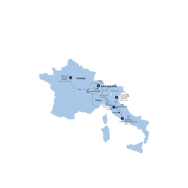 Live the European dream on this 11-day guided tour. Luxuriate in Rome, explore the Vatican with fast track entry VIP access, take an exhilarating open top cable car up Lucerne's Mt. Stanserhorn in Switzerland and dine in opulence at La Coupole in Paris. Venturing out in Italy, you'll get a genuine taste of fresh local cuisine among the canals of Venice. After your local Travel Director guides you through the stunning vineyard covered plains of Umbria, two all encompassing nights begin in Florence-breathing in an ambience of fine wine, cobbled streets and green marble cathedrals. Paris delivers at the finish with iconic sights, including the Arc de Triomphe, the Louvre, Place de la Concorde and the Champs Élysées.